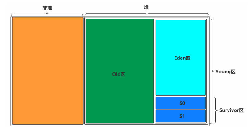 - 非堆区(Non-Heap):方法区、代码缓存、本地方法栈、线程栈等;