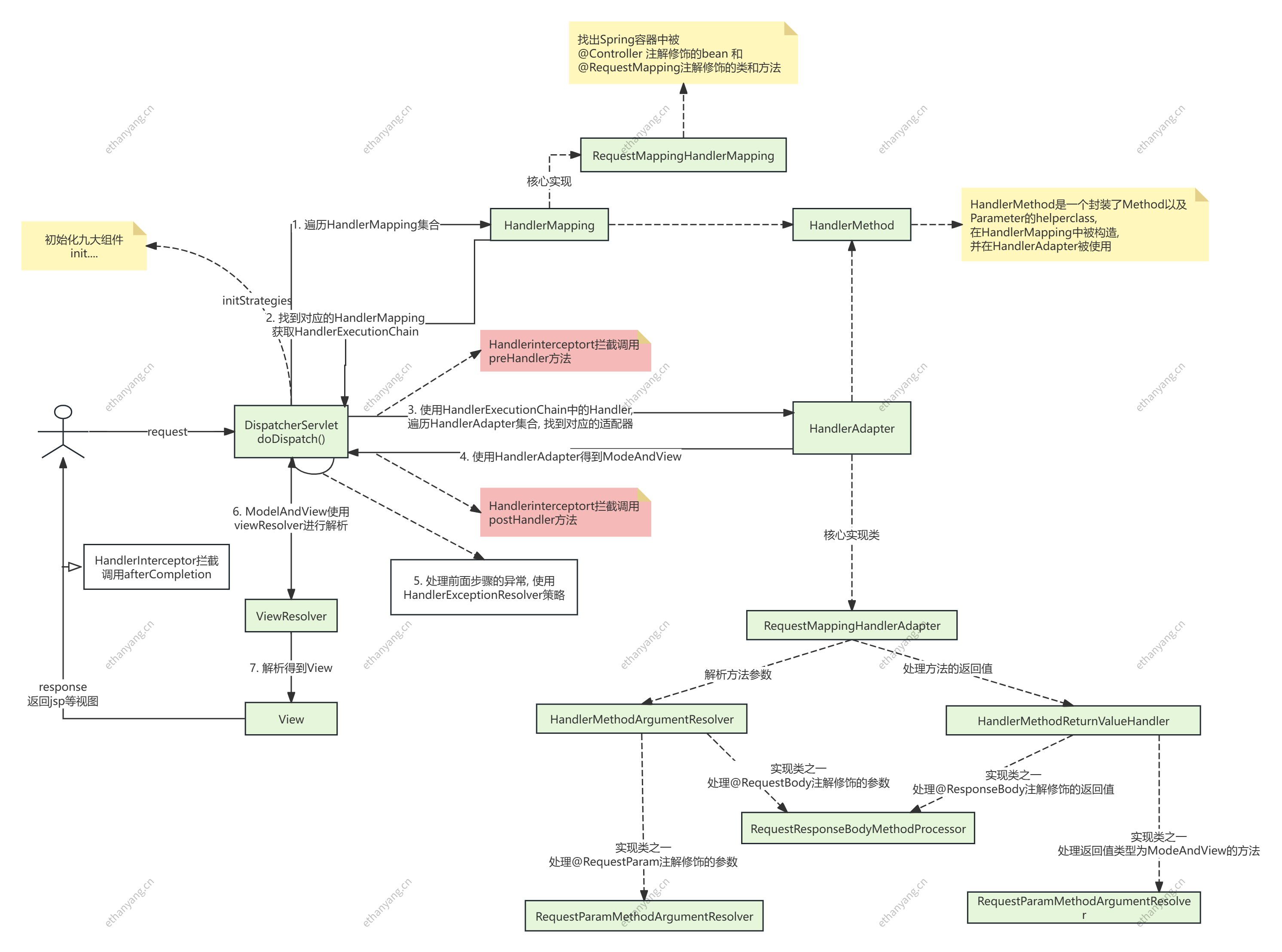 相对比较简单, 手写mvc基本核心流程已覆盖, 参考下图阅读源码即可