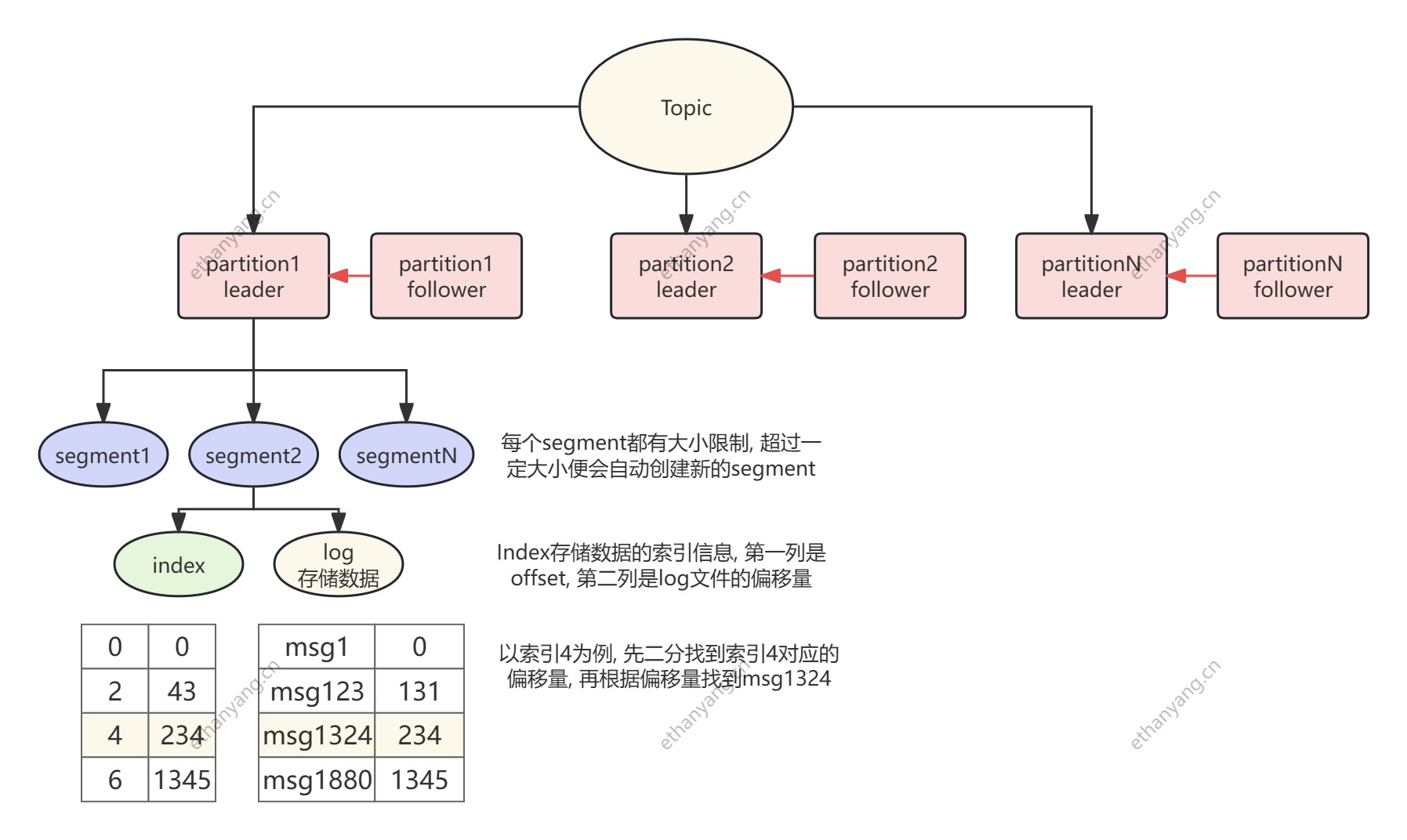 - 每个分区(Partition)对应多个段(Segment)