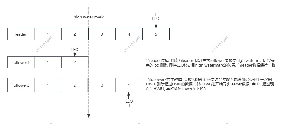 HW:所有 ISR 副本中 LEO(Log End Offset,日志末尾偏移量)的最小值。