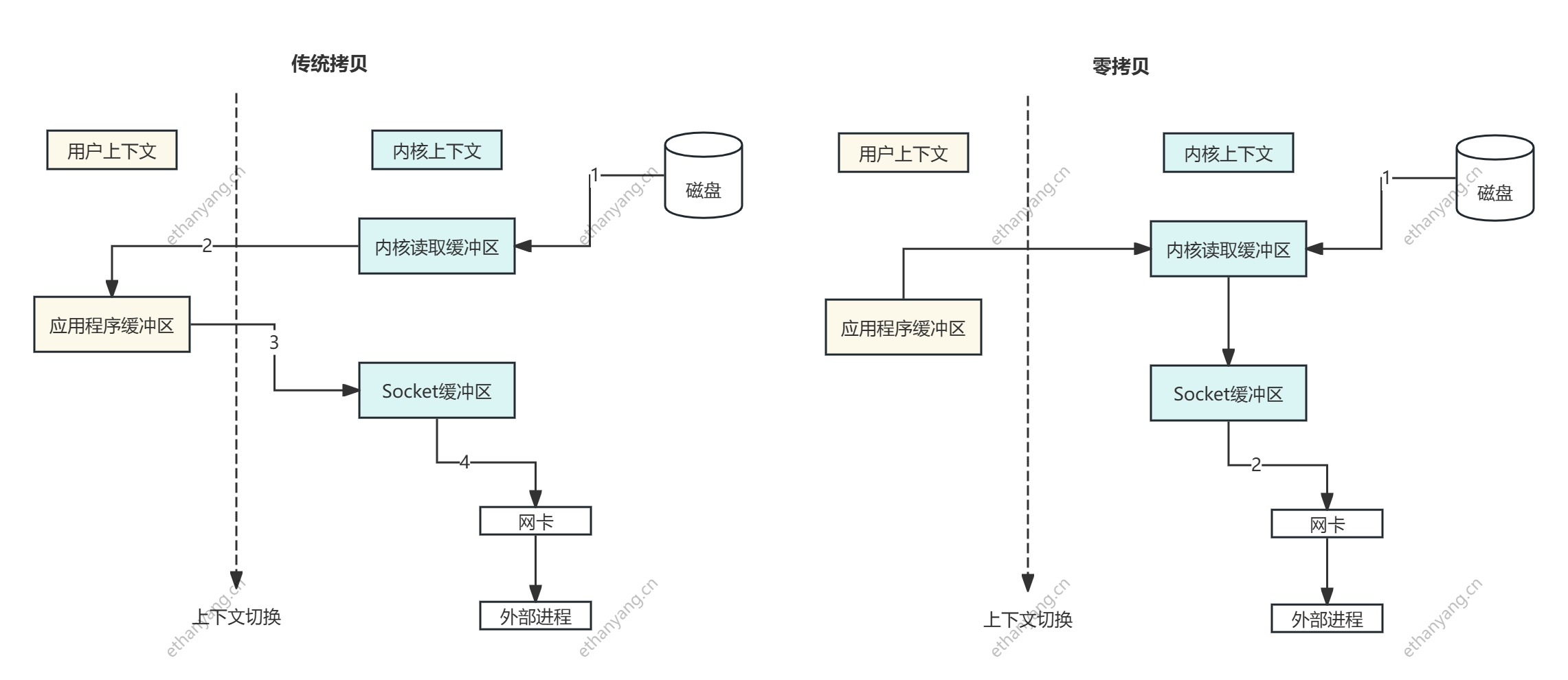 ✅ 总共涉及了 4 次数据拷贝 和多次用户态 ↔ 内核态的上下文切换,效率较低。