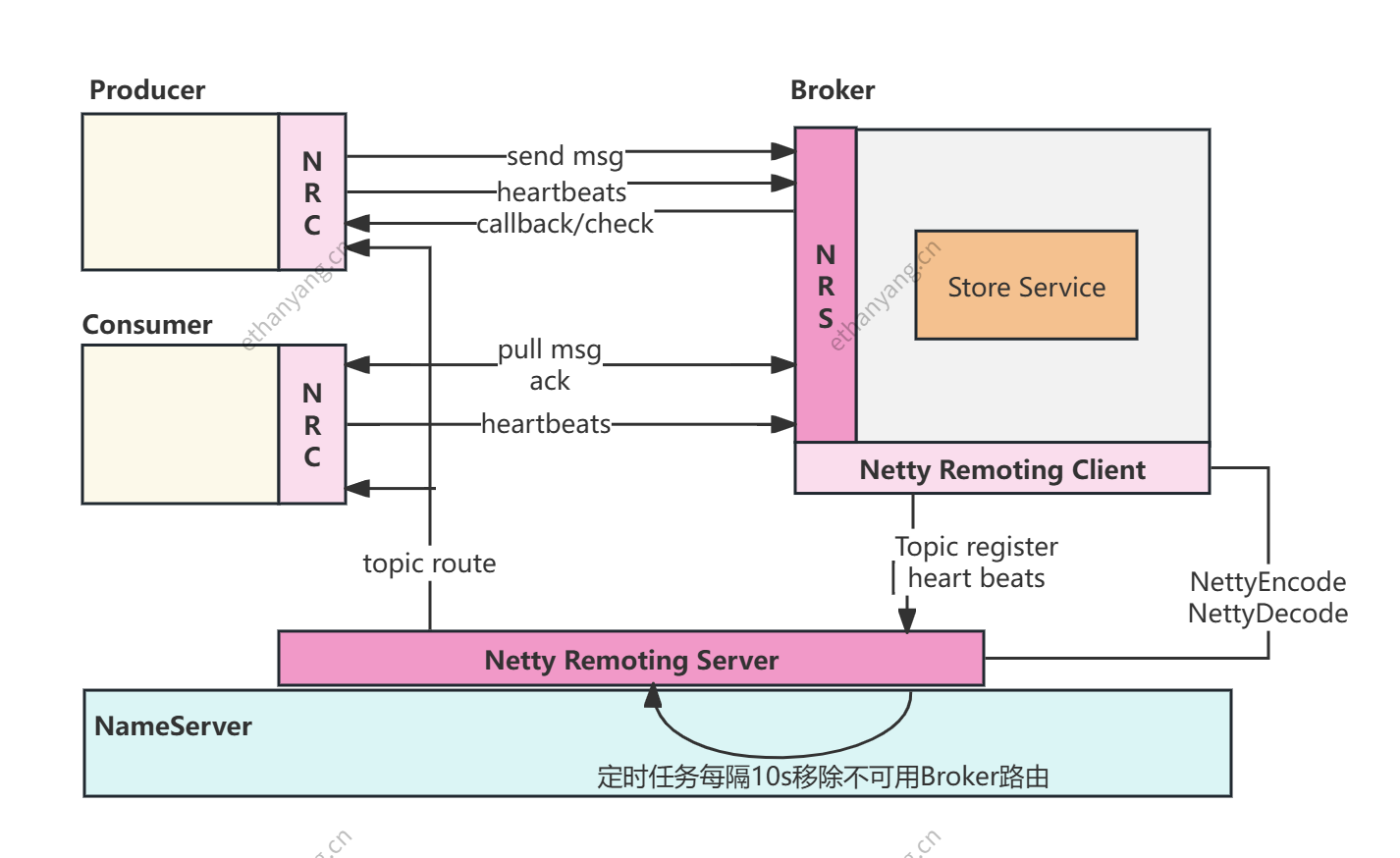 - Broker 启动后向所有 NameServer 注册自身的 Topic、Queue、读写状态等元数据