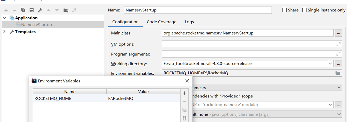 RocketMQ启动必须先启动NameServer,启动类是namesrv/目录下的NamesrvStartup类,不过在运行这个类之前必须要配置环境变量ROCKETMQ_HOME,变量值为RocketMQ的运行主目录。