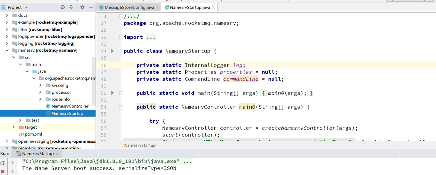 最后运行namesrv/目录下的NamesrvStartup类的main方法,NameServer启动成功!