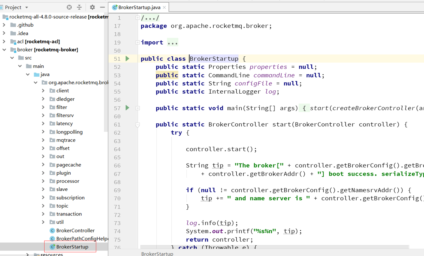 在broker模块找到broker模块,同时找到启动类BrokerStartup.java