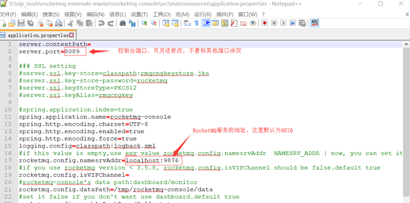 下载完成之后,进入‘\rocketmq-console\src\main\resources’文件夹,打开‘application.properties’进行配置。