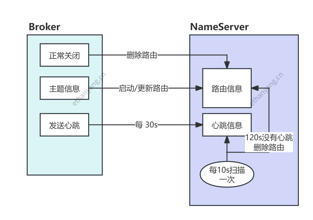 - Broker:默认 每 30 秒 向所有 NameServer 发送一次心跳